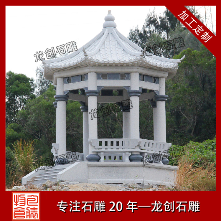 石雕涼亭一般在園林中多,可以叫做園林建筑,都是每個古建園林的點睛之物,所以多在視線交接的地方。石涼亭一般都在比較適合人們觀看景色的地方,能夠整體的看見石亭子的全身。都建于高顯處,其背景為天空,形象顯露,輪廓線完整,甚有可觀性。