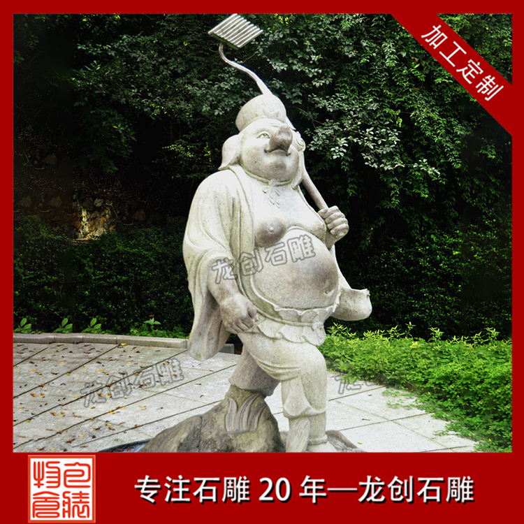 石雕豬八戒:八戒好吃懶做,貪財好色,貪生怕死,但又性格溫和,憨厚單純有時也很英勇;經常被妖怪的美色所迷,難分敵我。他對師兄的話言聽計從,對師父忠心耿耿,為唐僧西天取經立下汗馬功勞,是個被人們喜愛同情的喜劇人物。