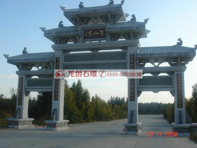 門樓牌坊雕刻的樣式,門樓牌坊設計時沒有樓的構造,既沒有斗拱和屋頂,而門樓牌坊設計時有斗拱和屋頂,它有更大的烘托氣氛。但是由于它們都是我國古代用于表彰、紀念、裝飾、標識的一種建筑物,而且多用于主要街道起點、交叉口、橋梁,古代多用于宮苑、寺觀、祠堂、衙署等處,景觀性很強,起到點題、框景、倩景等效果,長期以來老百姓對“坊”、“樓”的概念不清,所以到最后兩者成為一個互通的稱謂了。牌坊石雕、石雕牌坊、牌坊,現在很多石雕廠為了利益把石雕之本已經拋棄了,他們建造的門樓牌坊都是為了應時之景,雕刻工藝粗糙,已經徒有其表,門樓牌坊原本的神采和韻味乃至意義都不復存在。