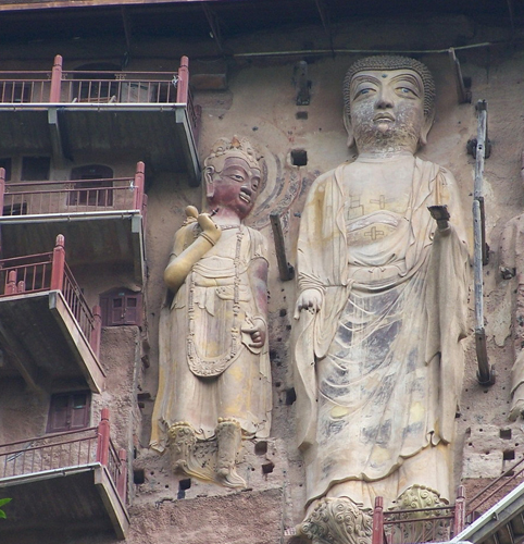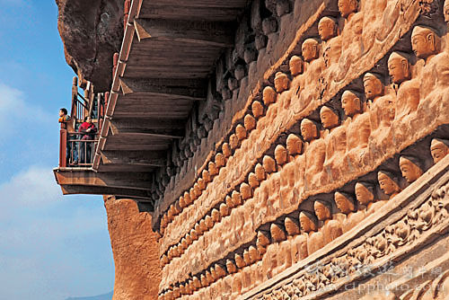這里的泥塑大致可以分為突出墻面的高浮塑,完全離開墻面的圓塑,粘貼在墻面上的模制影塑和壁塑四類。其中數(shù)以千計的與真人大小相仿的圓塑,極富生活情趣,被視為珍品。石窟建自公元384年,后來經(jīng)過十多個朝代的不斷開鑿、重修,遂成為中國著名的大型石窟之一。