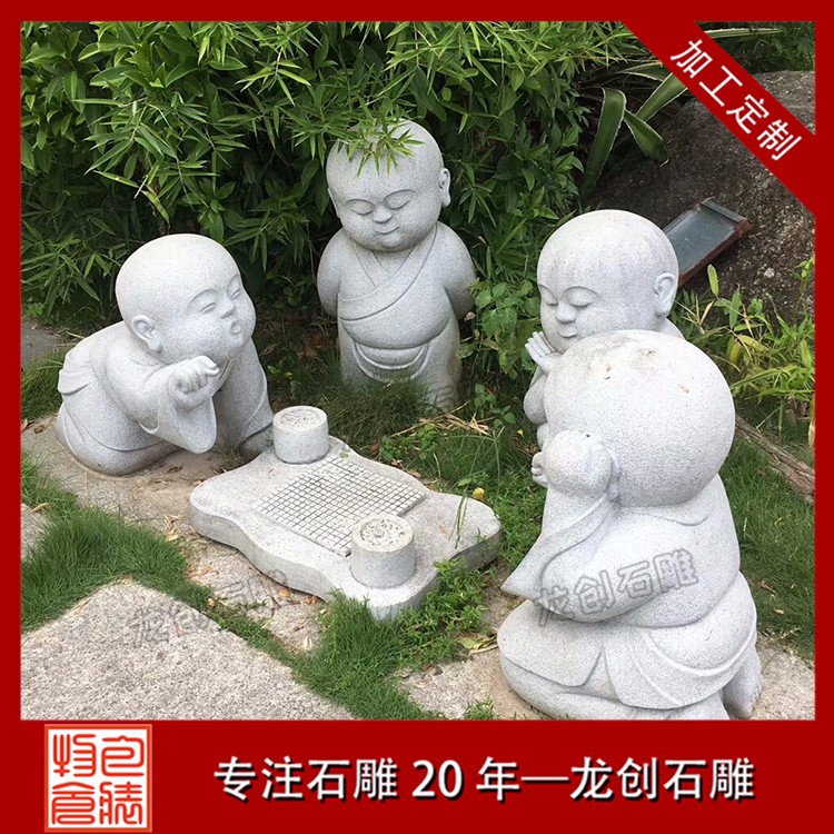 石雕精品小沙彌就是用優(yōu)質(zhì)石材雕刻制作的小和尚造型,一般都是10歲以下的孩童雕塑。由于小孩的天真爛漫,各種各樣有趣的造型都會(huì)做出來(lái),比如下棋的小沙彌,睡姿的小沙彌、嬉戲的以及功夫小沙彌,打掃衛(wèi)生的等等,也有一些修行的小沙彌造型,比如參禪打坐的造型,敲木魚(yú)的造型。石雕小沙彌的百態(tài)千姿是寺廟諸佛菩薩雕塑里面較多的一種,也是讓信眾們發(fā)自?xún)?nèi)心的喜愛(ài)和尊敬的一種佛教弟子塑像。