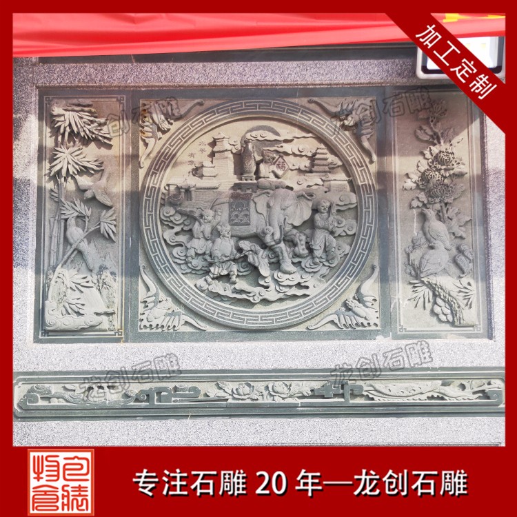 石材浮雕加工定制除了墻體浮雕壁畫雕刻外,還常集中在墻體的基座、墻身、墻檐、墻帽等處,無論是院內(nèi)的院墻、墻頂?shù)呐畠簤€是大門旁的翼墻我們都能看到。體基座一般都由磚砌筑成須彌座樣式,而為了防水、美觀,也經(jīng)常由石材筑成。基座常雕出虎牙形、卷草形圖案。墻身、墻檐、墻帽等處則是雕刻較多的地方,如采用多層浮雕、鏤空雕雕出場(chǎng)景深遠(yuǎn)的美麗景色、戲文故事等,墻帽下檐雕出如連珠混、卷草彎等多種裝飾浮雕壁畫圖案。