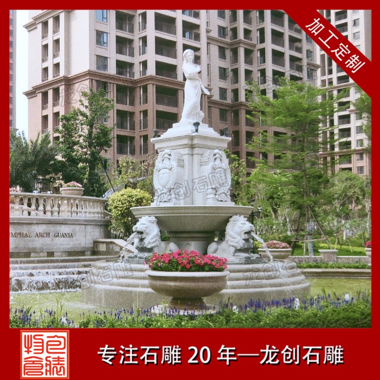 園林景觀石雕噴泉水缽雕塑是一種石材做成的盆狀或者罐狀的石雕作品,一般來說周邊有雕刻的紋路以及雕刻的附加飾品,然后組合成一個比較大的裝水,儲水的容器,并且部分石雕噴泉雕塑利用水壓把水從石雕噴泉雕塑的上端噴或者流出,形成一種特別的景象的石雕產品。石雕噴泉雕塑作為一種裝飾產品,所以一般適用于比較高檔的裝飾,不過隨著社會的發展,現在的水平高中低檔的價格可以滿足不同客戶的需求,從高端裝飾慢慢的成為了家居擺件,公司擺件,公園擺件,景區擺件等等。