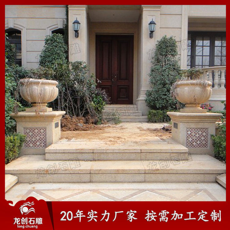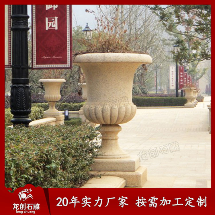黃金麻石雕花缽在近幾年被很多應用到園林景觀美化工程中,成為小區別墅之中常常運用的花草栽培器物。花盆的樣式設計多種多樣,可以是圓形、半圓形、方形、多邊形等,立面可以分單層、多層等。設計的依據是要配合應用地點的環境特點。