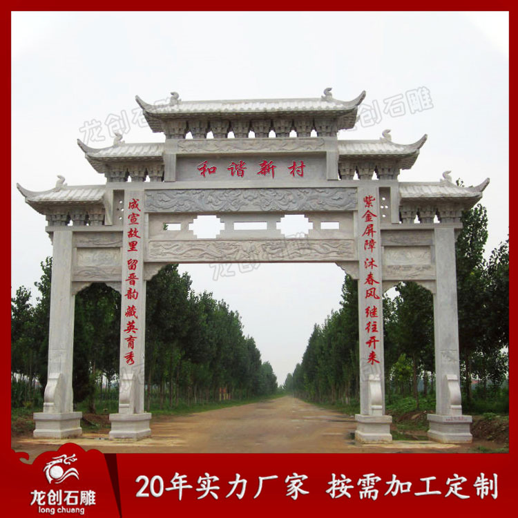 三門石雕牌坊在農村地區也是比較常見的,三門五樓牌坊定制也比較多,尤其是現代一些新農村建設中更是經常可以看到這類三門石牌坊設計的農村石牌坊。農村地區的牌坊通常起到了標志地名以及裝飾性作用,在實際雕刻的時候應當要考慮到農村地區的特色以及風土人情等情況,從而能夠雕刻出更為精致的石雕牌坊作品,展現牌坊的建筑之美。
