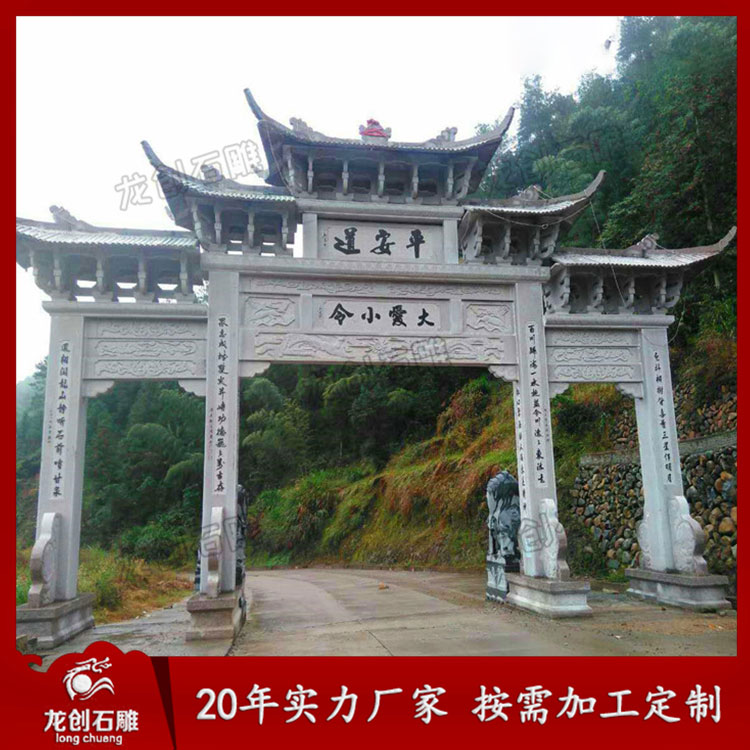 村口牌坊牌樓作為提升農(nóng)村形象的重要建筑物,在選擇上要綜合考慮,農(nóng)村修建村口門樓一般以簡(jiǎn)單大方為主,而村口門樓分為有樓的和沒樓的兩種樣式,門數(shù)又分為一門石牌樓、三門石牌樓、五門石牌樓等。村口門樓一般一門一樓三樓或三門三樓五樓七樓較為常見,五門的很少見。石牌樓常見的這幾種樣式也是農(nóng)村人都非常喜歡的,原因一簡(jiǎn)單大方,原因二價(jià)格實(shí)惠,這兩點(diǎn)很重要。