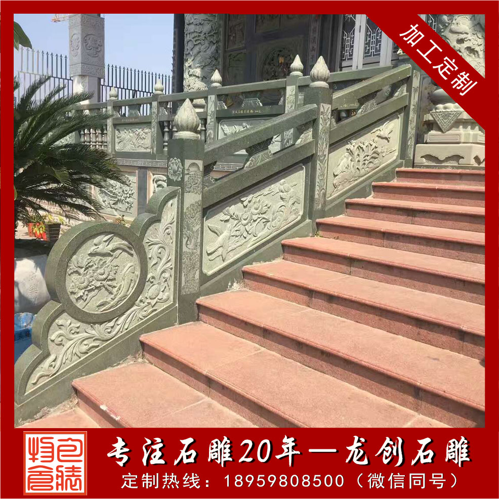 從欄桿的雕刻用料看,普通青石、綠色青石等是比較基礎的雕刻材料,普通青欄桿價格在500-700元左右,根據雕刻建造情況,欄桿的價格也都會有所不同??紤]到現在特殊區域使用需求,也有不少選擇綠色青石欄桿或者綠山巖欄桿,高的話達到1000元以上等等。